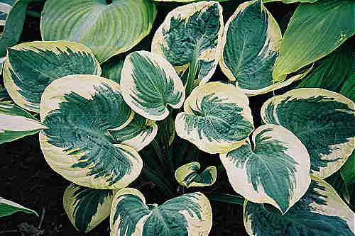 bylina rabatowa, roślina wieloletnia, na rabaty, okrywowa, liść niebieski, jasny brzeg, pomarszczony, wys. 80, wilgotność zwiększona, stanowisko zacienione lub półcień, gleba próchniczo-piaszczysta, żyzna, lekko kwaśna, mrozoodporność całkowita,