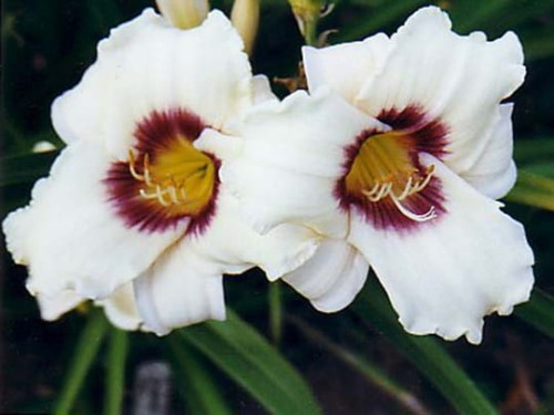 bylina rabatowa, roślina wieloletnia, na rabaty, na kwiat cięty, kwiat kremowy, fioletowy pierścień, żółty środek, ~10cm (VII-VIII), liść zielony, diploid, wys. 70, wilgotność zwiększona, stanowisko słoneczne lub lekki cień, gleba przepuszczalna, żyzna, mrozoodporność zadowalająca,