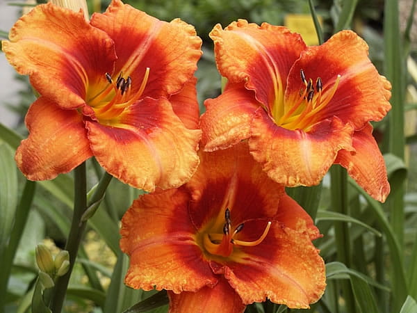 bylina rabatowa, roślina wieloletnia, na rabaty, na kwiat cięty, kwiat pomarańczowo-czerwony, żółty pasek, falbanka, ~12cm (VII-VIII), liść zielony, tetraploid, wys. 70, wilgotność zwiększona, stanowisko słoneczne lub lekki cień, gleba przepuszczalna, żyzna, mrozoodporność zadowalająca,