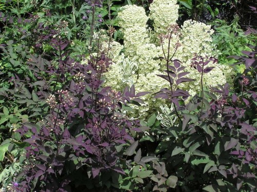 bylina rabatowa, roślina wieloletnia, na większe powierzchnie, okrywowa, kwiat biały (VII-VIII), liść brązowo-purpurowy, wys. 150, wilgotność przeciętna, stanowisko słoneczne lub lekki cień, gleba próchnicza, żyzna,
